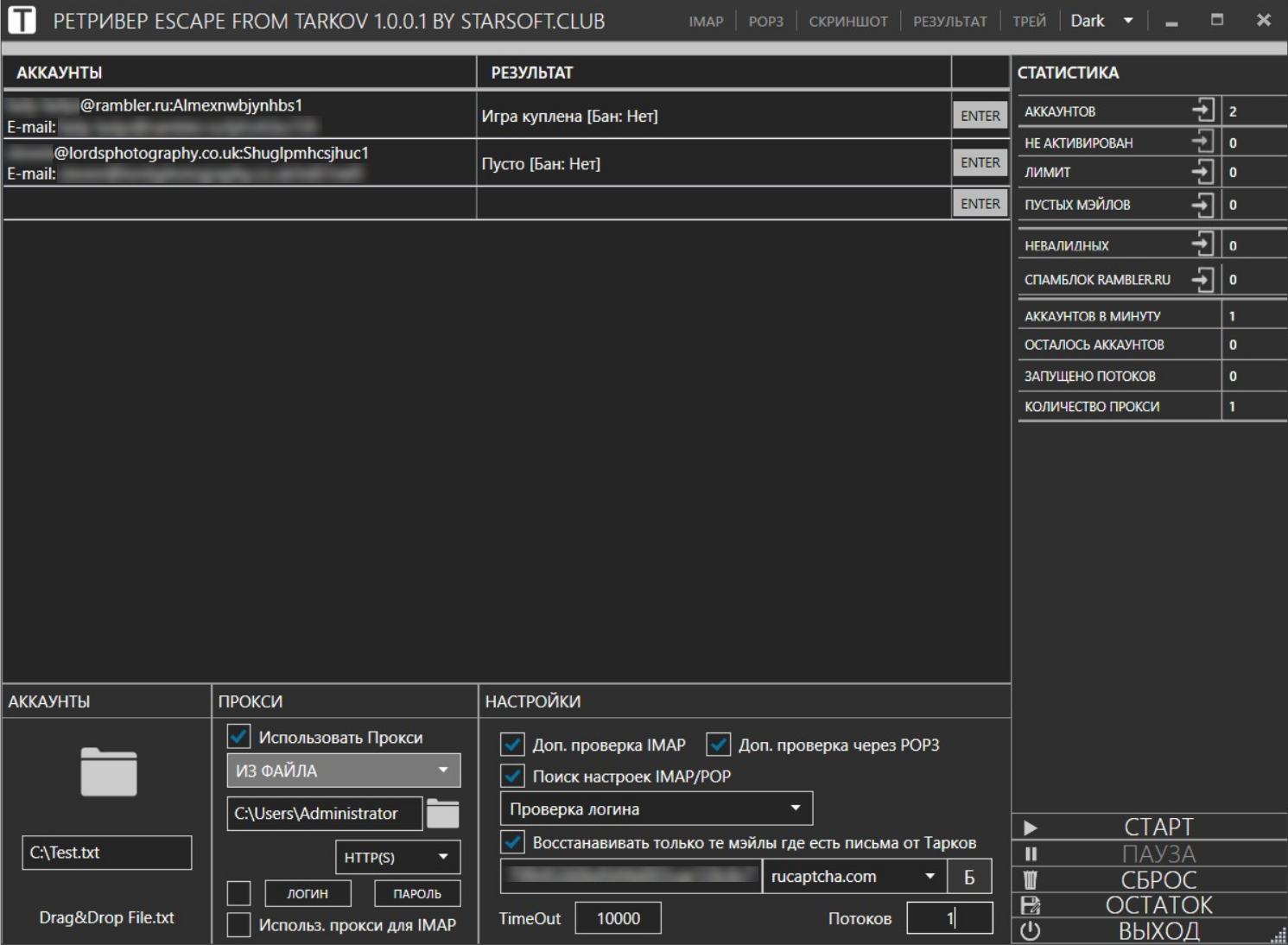 Программа позволяет восстановить ваши аккаунты через мэйл (IMAP в том числе Rambler) в игре Escape from Tarkov и сбросить пароли на них, есть функция восстанавливать только те мэйлы где есть письма от игры, а так же через режим Проверка логина (Формат базы для этого режима - login:password|mail:password, т.е. связки которые софт выдал после режима Восстановления) проверить восстановленные аккаунты на наличие купленной игры и бан аккаунта.